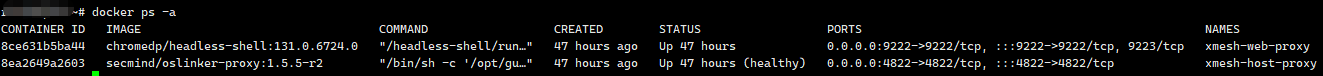 # 导入工具的docker镜像 $ docker load -i images-secmind-oslinker-proxy-1.5.5-r2.tar.gz $ docker load -i images-chromedp-headless-shell.tar.gz # 启动工具服务 $ docker compose up -d查看服务是否启动正常: